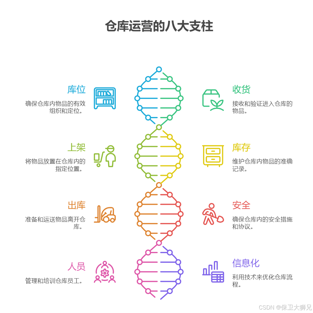 库位、收货、上架、库存、出库、安全、人员、信息化,这八个环节如果缺一块,仓库就会出问题。