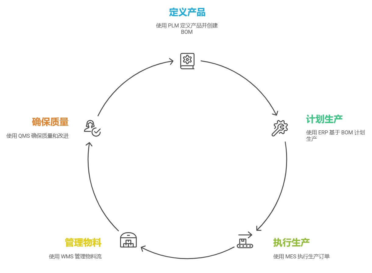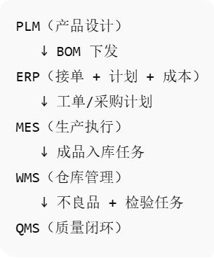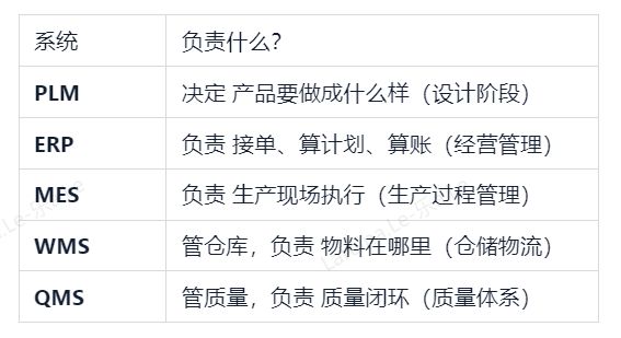 PLM 决定 “做什么”, ERP 计划 “怎么做”, MES 执行 “做到了多少”, WMS 管物料在哪里,QMS 保证能交付好产品。