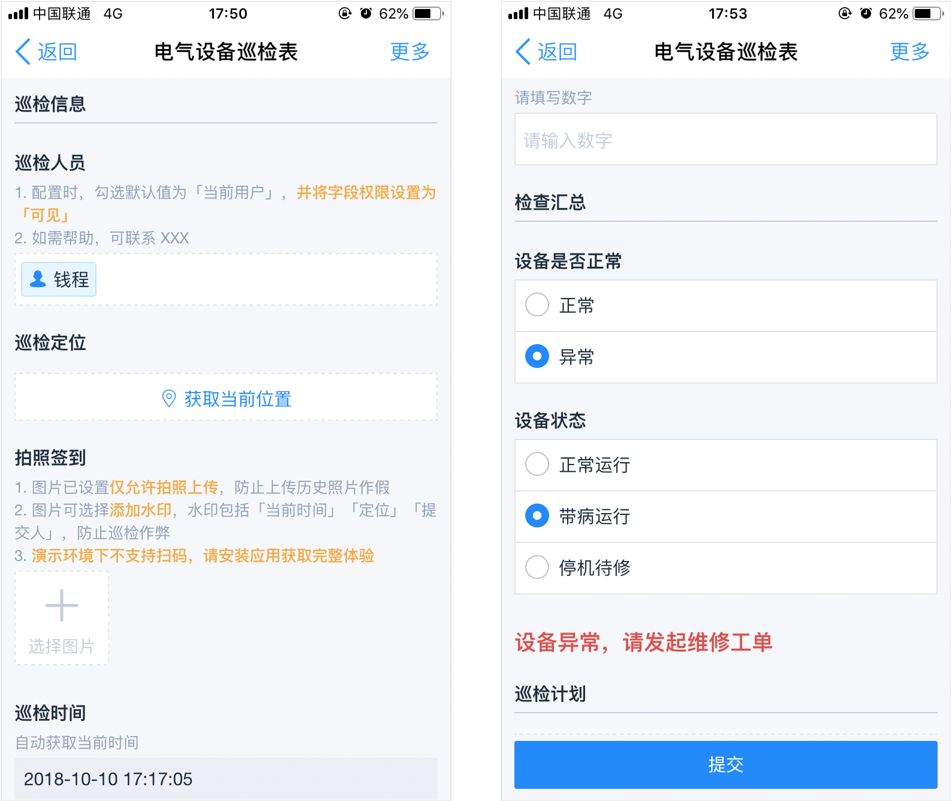 - 巡检表单可以根据工艺/设备类型自动套模板