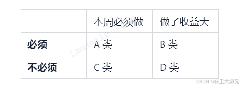 你只要盯着 A 类(本周必须做、必须的)即可。 B 类可抓可不抓,但优先抓。 C 类往往可以砍掉。 D 类绝大多数时候是自嗨型任务。