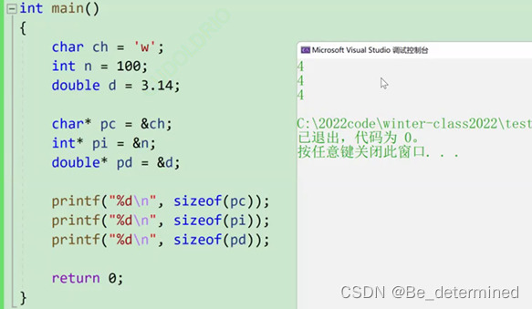 在VS指针大小打印的是4,是因为编译器是32位,当然也可以调整为64位。