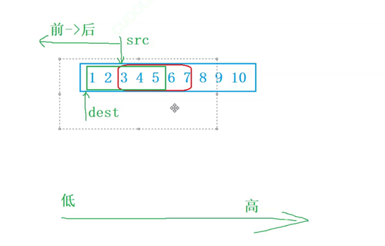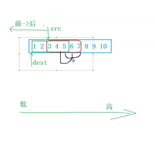 当dest再src前面的时候,应该从前向后拷贝(针对dest目标区域来说)就是先把3给1,4给2,这样当5给3的时候3已经用过了,所以被覆盖没有任何问题。