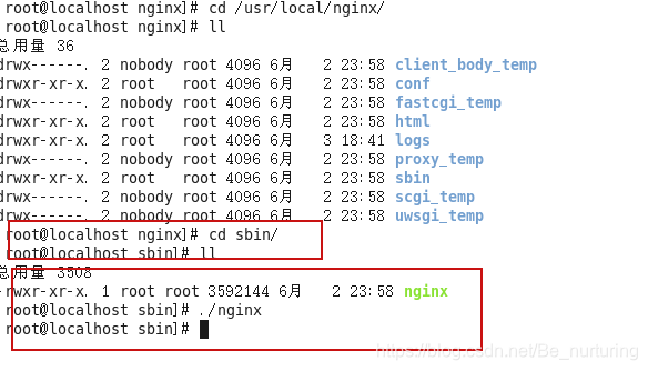 然后进入sbin 目录 会有一 nginx文件 然后执行 ./nginx 没有任何信息证明已经启动了