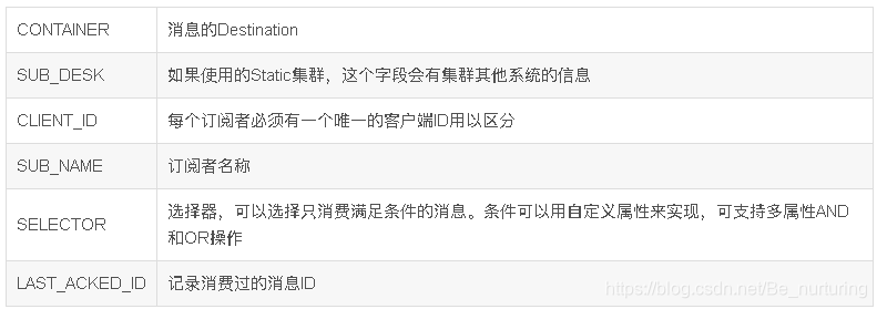 activemq_acks(订阅关系表,针对于持久化的Topic,订阅者和服务器的订阅关系会保存在这个表中):