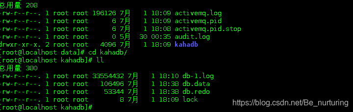 kahadb在消息保存目录中有4类文件(我刚刚重启了服务,所以只有3个,少了一个db.free文件)和一个lock。