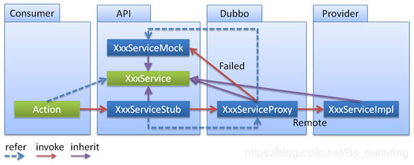 远程服务后,客户端通常只剩下接口,而实现全在服务器端,但提供方有些时候想在客户端也执行部分逻辑,比如:做 ThreadLocal 缓存,提前验证参数,调用失败后伪造容错数据等等,此时就需要在 API 中带上 Stub,客户端生成 Proxy 实例,会把 Proxy 通过构造函数传给 Stub [1],然后把 Stub 暴露给用户,Stub 可以决定要不要去调 Proxy。