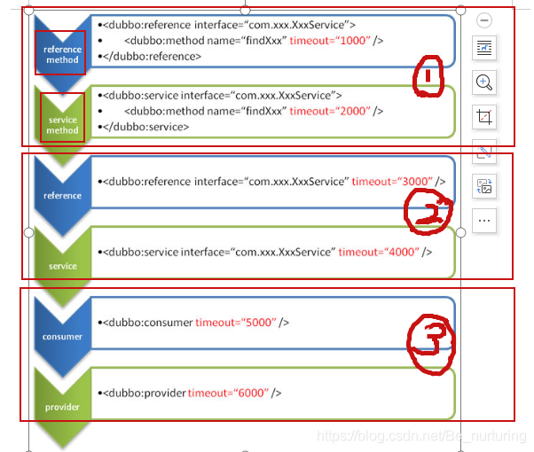 超时的优先级别图,有上到下优先级别,先方法①,后接口②,全局最后③ ,每个级别都是对应的消费方优先