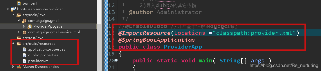将application.properties文件中的配置都注释掉,也就是相当于provider.xml文件放入到resource资源目录下,暴露服务上面@Service注解也可以去掉了