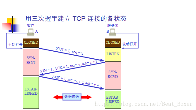 张三首先向李四招手(SYN = 1,seq=x),此时他处于syn_sent状态,李四看到张三想自己招手,此时处于syn_rcvd状态,然后点了点头挤出了一个微笑(ACK=1,ack=x+1),张三看到李四确认看到了他所以此时张三处于 estalished状态;