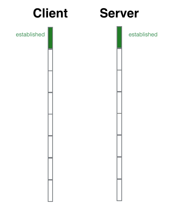 我们看到有两个中间状态,syn_sent和syn_rcvd,这两个状态叫着「半打开」状态,就是向对方招手了,但是还没来得及看到对方的点头微笑。syn_sent是主动打开方的「半打开」状态,syn_rcvd是被动打开方的「半打开」状态。客户端是主动打开方,服务器是被动打开方。