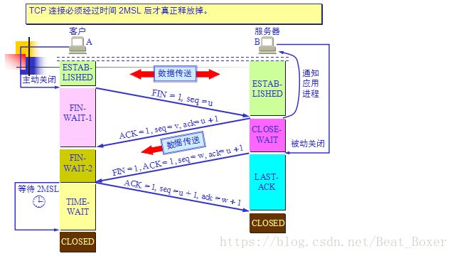 此过程和连接过程类似,张三挥手(FIN=1,seq=u),此时处于fin_wait_1,李四看到了向张三伤感的微笑(ACK=1,ack = u+1,seq = v),处于close_wait,此时张三处于fin_wait_2状态,李四挥手(FIN=1,seq = w),此时处于last_ack,张三看到李四挥手,张三看到后伤感的微笑(ACK=1,ack = w+1,seq = u+1),此时张三处于time_wait状态,李四收到张三的ACK后处于,closed状态;