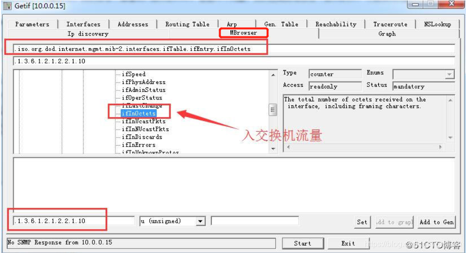 切换菜单栏为:“MBrowser“,依次选择:iso->org->dod->internet->mgmt->mib-2->interface->ifTable->ifEntry->ifInOctets