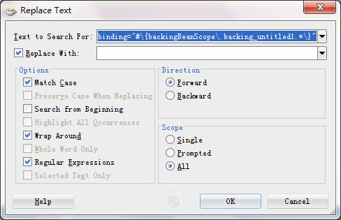 只能手工去除,好在JDeveloper支持正则表达式,以型如 binding="#{backingBeanScope.backing_untitled1.cb1}"为例,其正则表达式为binding="#\{backingBeanScope\.backing_untitled1.*\}"