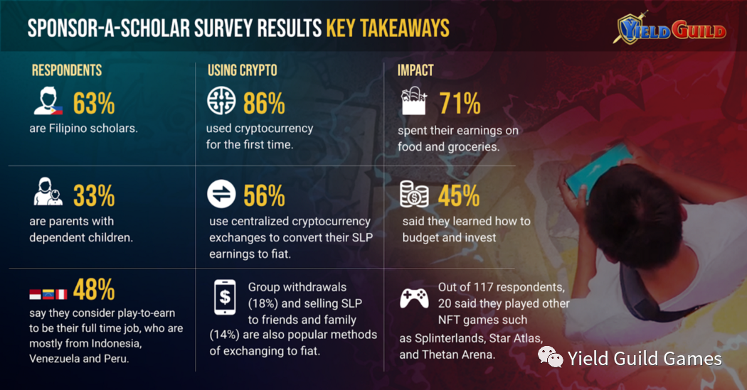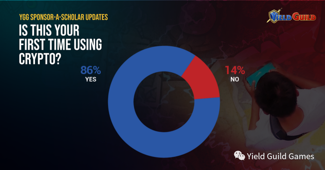 这表明了 YGG 是如何通过边玩边赚的方式让主流受众进入 Web3 的途径,总共有 86% 的调查对象表示,通过 Sponsor-A-Scholar 项目玩区块链游戏并以加密货币形式赚取奖励是他们第一次接触使用到加密货币。