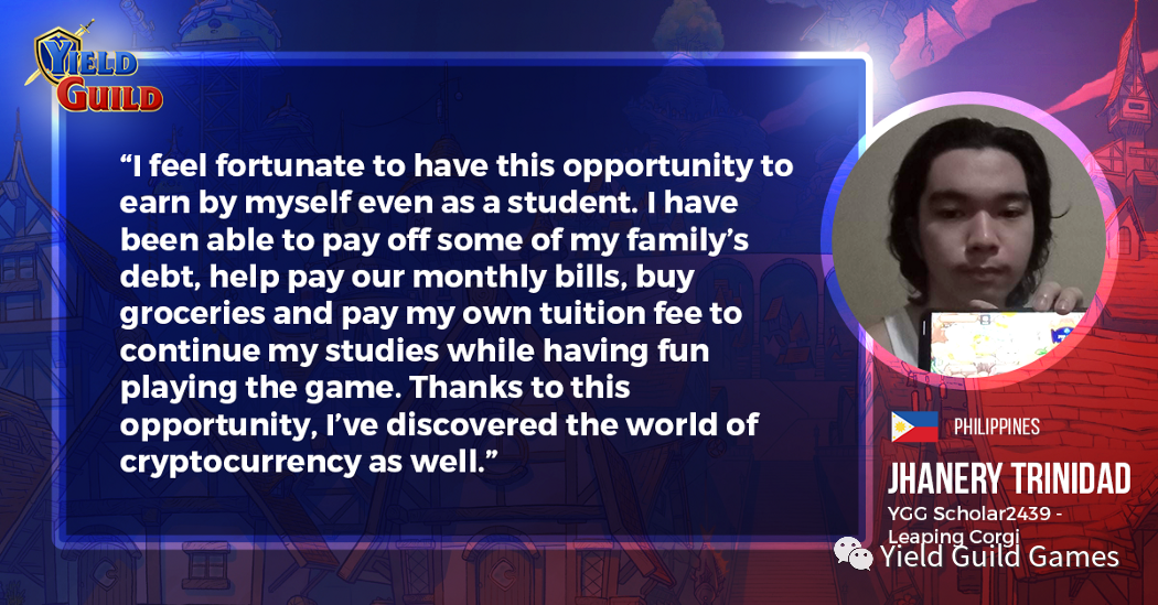 2021 年 8 月,一位与卵巢癌作斗争的菲律宾学员 Maria 获得了 FTX 奖学金。因为边玩边赚的收入,她能够支付药物和医院费用的账单,来维持她的治疗。在 YGG 奖学金经理 Shanks 的监督下,公会还协助她筹集了额外的资金来支付她的手术费用。不幸的是, Maria 在 2021 年去世了。她的 YGG 奖学金账户被转给了她的侄子,这样他就可以继续玩下去,为他的家庭挣钱。