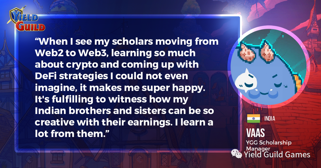 一位来自印度的学生——学员 Tejal 用他的 Axie Infinity 收入支付学费。他还学习了如何投资和参与 DeFi 等加密活动。Tejal 在 YGG 的奖学金经理 Vaas 表示,他为看到他的学员利用他们的额外收入来试验和探索 Web3 提供的机会感到自豪,并指出投资加密和 DeFi 是一种特权,否则这些投资对于那些收入低到只能勉强维持温饱的人来说是遥不可及的。