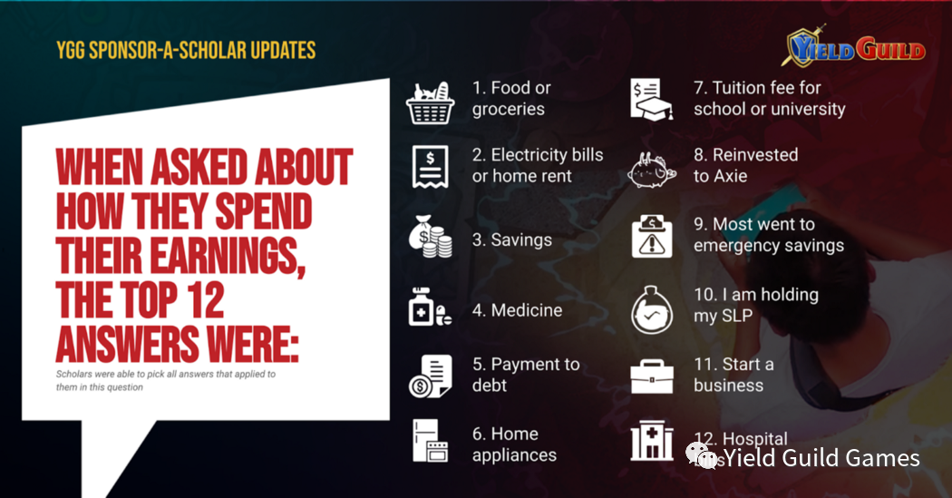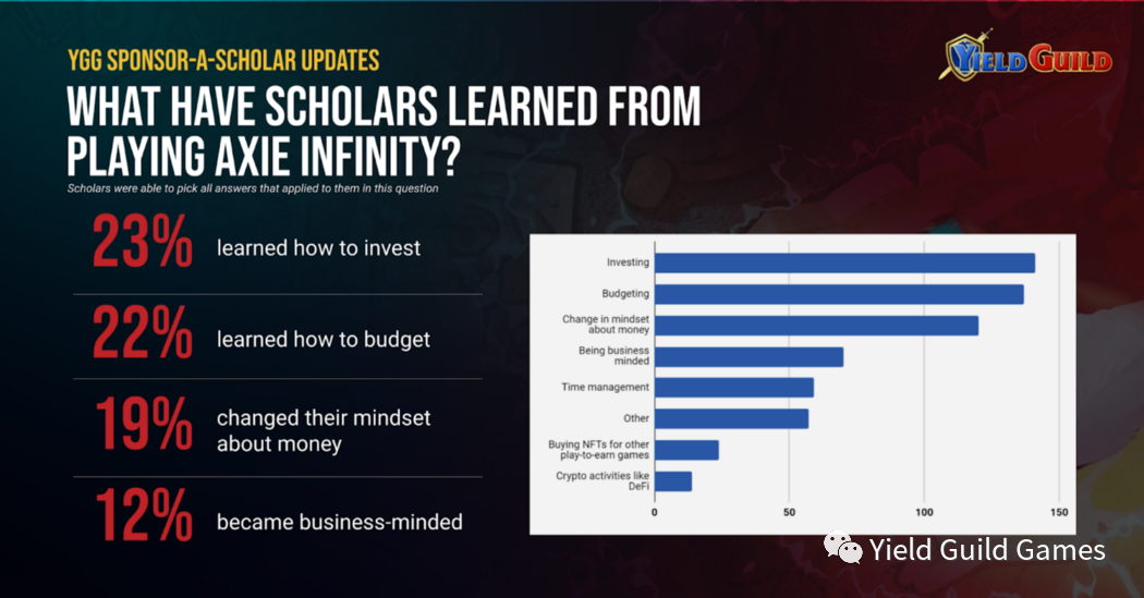 YGG的Sponsor-A-Scholar项目通过资助NFT资产,帮助全球贫困地区的玩家参与AxieInfinity游戏,实现收入增长。项目自2021年起,不断吸引赞助商,如FlyingFalcon、LeapingCorgi和FTX,对学员生活产生显著积极影响。调查发现,游戏收入不仅补充日常生计,还推动创业、教育和财务管理的提升。