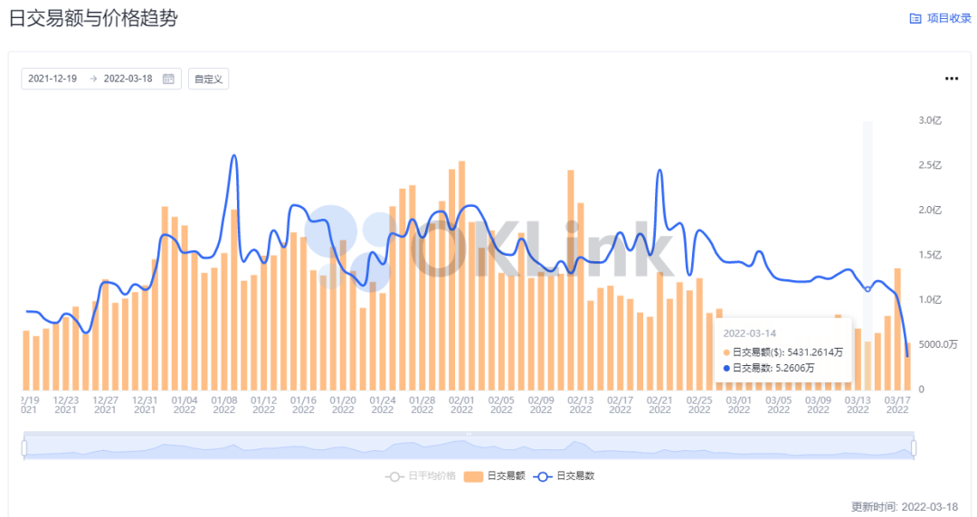 据欧科云链数据显示,3月14日NFT市场日交易额为5431万美元,日交易数为5.26万,日交易数继续下滑,日交易额本周增长。