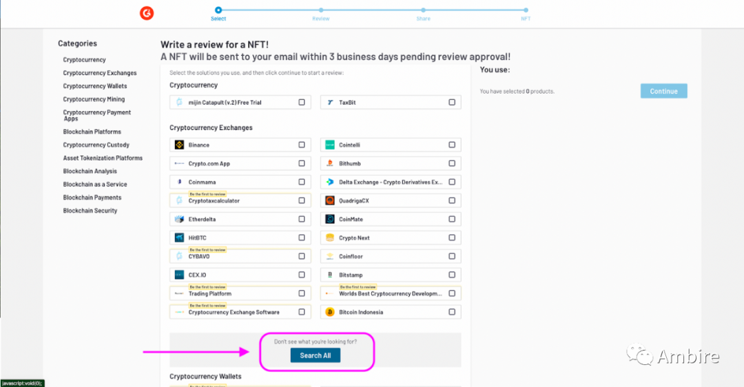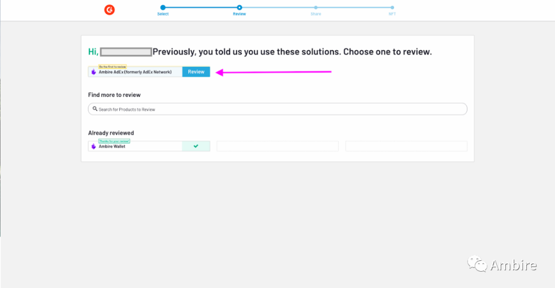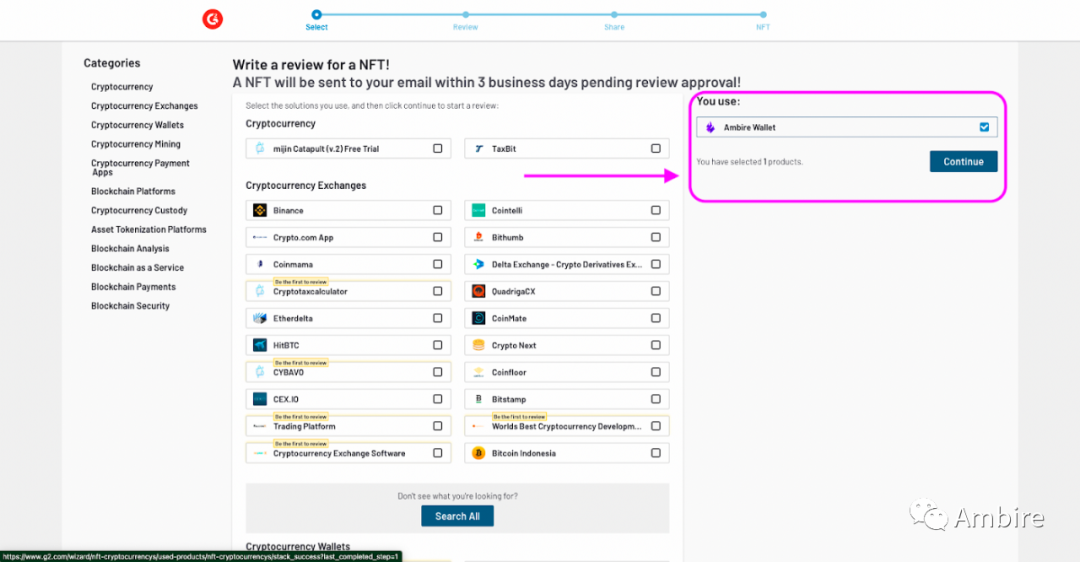 要评价 Ambire 钱包,请访问这个链接:https://www.g2.com/wizard/nft-cryptocurrencys/used-products/nft-cryptocurrencys?last_completed_step=0