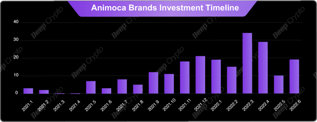 此外,我们统计了2021年之后每个月Animoca Brands 投资项目的数量。之所以统计这两年的数据原因在于,其一Animoca Brands 2017年开始布局加密市场,但真正加快投资步伐在这两年,前几年的投资项目数量相对较少;其二2021年被称为“NFT”之年,加密领域迎来了爆炸式的增长。从投资活跃度来看,2022年上半年Animoca Brands投资项目的数量整体高于2021年,活跃度明显增加,其中2022年3,4月份最为活跃。