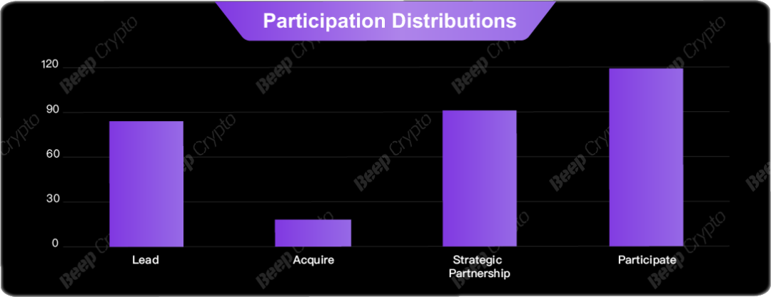 从Animoca Brands 领投参投项目分布来看,312个项目中,Animoca Brands领投项目有84个,参投的项目达119个,参与战略投资成为合作伙伴的项目数量和收购项目数量分别为90个和18个。