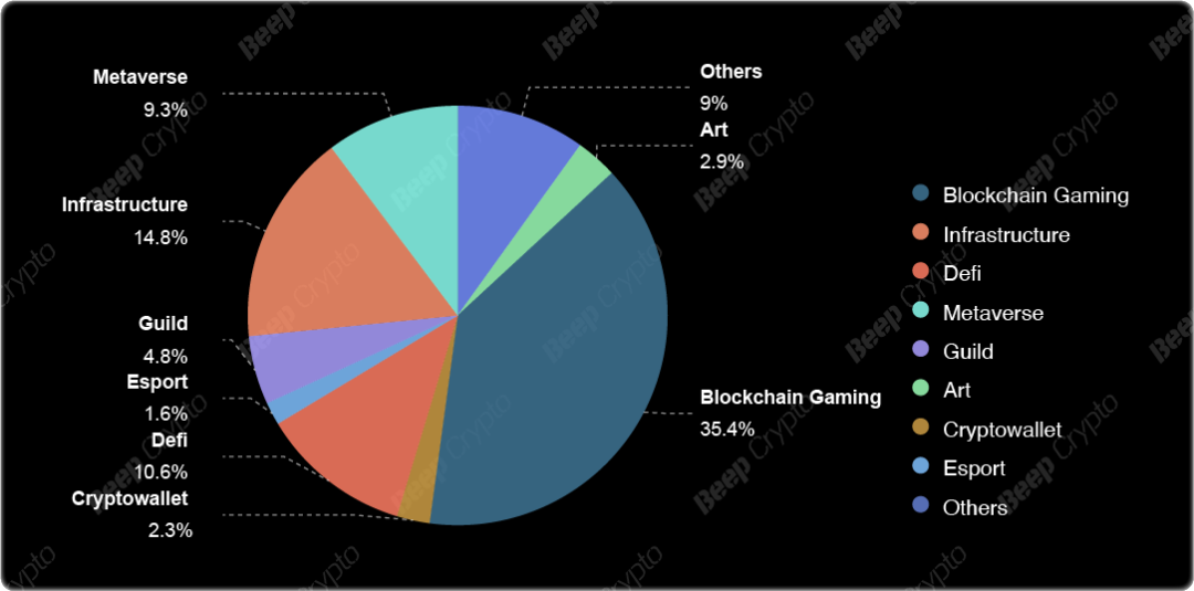 本报告不完全统计了2017年6月30日至2022年6月30日之间,Animoca Brands投资的312个项目。数据显示,报告期内,Animoca Brands投资领域前三的是区块链游戏(Blockchain Gaming)、基础设施(Infrastructure)、去中心化金融(DeFi),投资数量分别占总投资的35.4%、14.8%、10.6%。