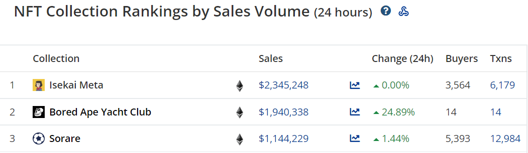 据 CryptoSlam 数据显示,NFT二级市场近24小时交易额前三名项目分别为Isekai Meta(234万美元)、Bored Ape Yacht Club(194万美元)、Sorare(114万美元)。近七天交易额前三名项目分别是CryptoPunks(2301万美元)、Bored Ape Yacht Club(1239万美元)、Otherdeed(1077万美元)。