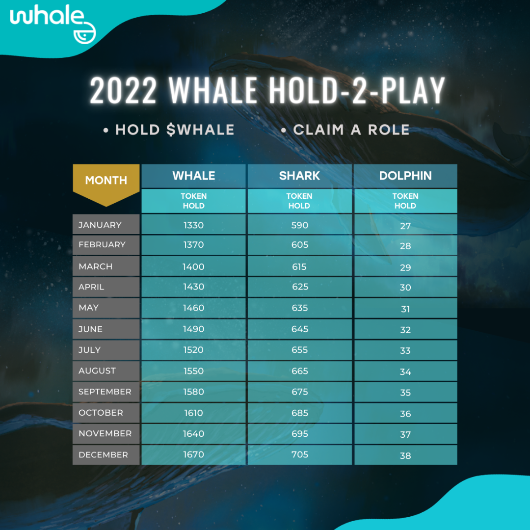 通过在你们的钱包中保持 $WHALE 的通证数量来维持持有的角色。每个月,维持角色所需的金额都会增加。
