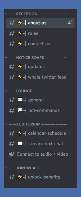💬 直播文字聊天:(聊天)没有直播时通常会关闭这个频道。当 discord 中出现 WHALE 的直播活动时,该频道将被解锁。在这里,你可以通过文字、表情符号和 GIF 来参与我们的活动。为了尊重我们的嘉宾和观众,请大家在发言时围绕活动话题本身。