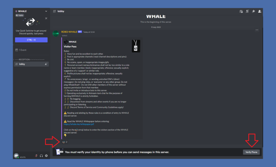 在你们来到 WHALE 服务器后,请立即到 #LOBBY 领取你们的访客证。