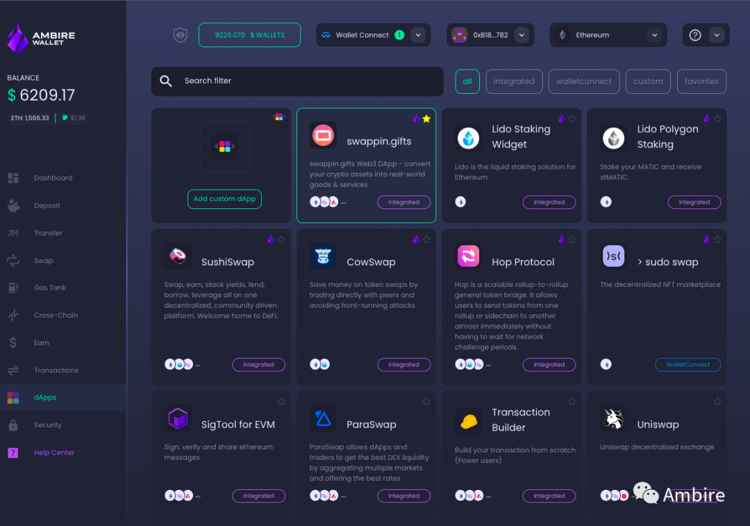 从今天开始,swappin.gifts 已被整合到 Ambire 的插件系统中,只需在 dApp 列表中点击一下就可以使用☑️