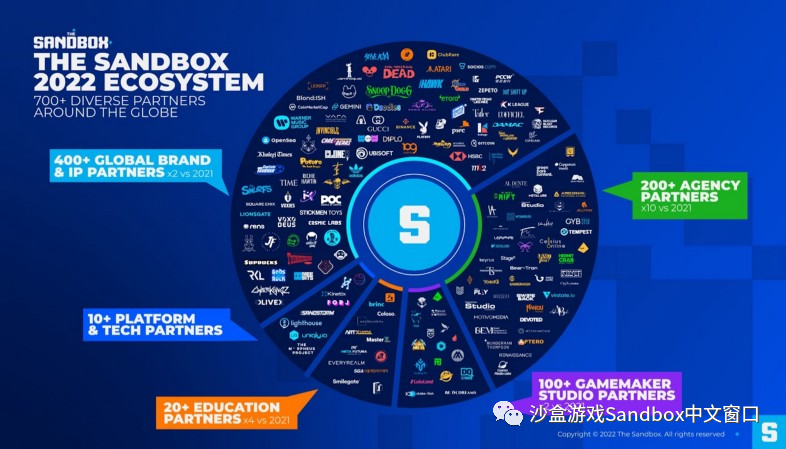 在过去的 12 个月里,加入 The Sandbox 生态系统的合作伙伴数量翻了一倍,在全球范围内建立了一个有 700 多个多元化的合作伙伴生态系统,通过全球品牌将他们的社区带入元宇宙,机构和工作室建立体验,技术平台和教育工作者加速 Web3 的民主化。