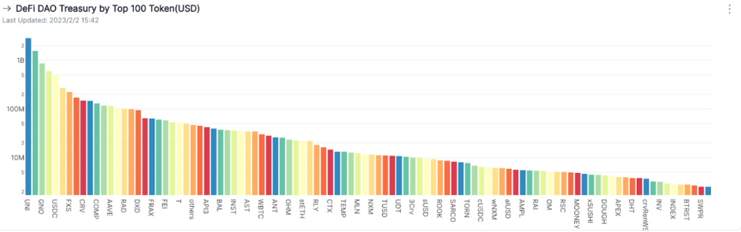 在所有DeFi DAO的国库资产中,占比最多的资产前10分别是UNI, BIT, GNO, ETH, USDC, LDO, FXS,DAI, CRV, SNX。