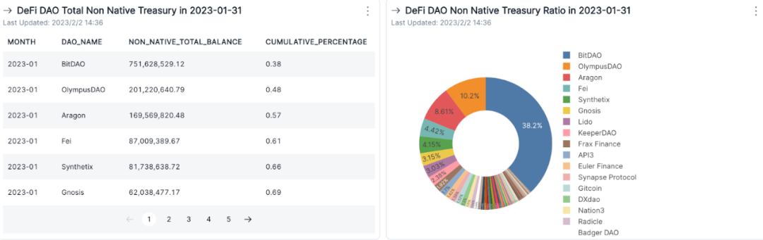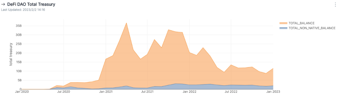 纵观DeFi DAO数据,2020年中旬至2021年中旬,国库总值迅猛发展,从10亿美金增长至350亿美金,1年内增长超3500%。2021年中旬至2021年底,国库总值随着行情时有反复,维持在150亿~300亿之间。然而在2022年开年至中旬,DAO国库总值持续下滑,最低触及70亿美金。2022年下旬至2023年,国库总值有所回暖,目前DeFi相关DAO国库总值超100亿美金(https://thepass.to/leaderboard)。虽然国库总值受行情影响较大,但非原生代币(Non-Native Token)资产总值相对稳定,维持在20亿美金左右。