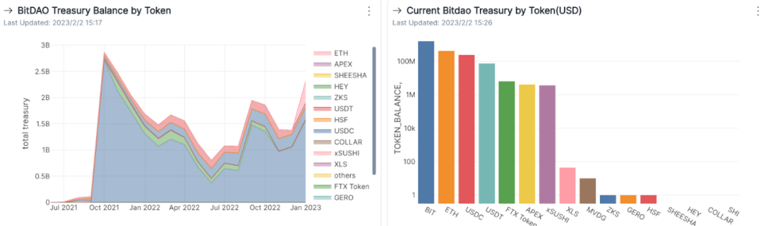 以BitDAO为例(1月底),其Native Token 原生代币(BIT)占比76.9%,USDT和USDC占比22%。因其自有代币占比过高,国库在2022年中上旬受行情影响下滑72.07%,下旬有所回暖,但11月受FTX暴雷影响继续下滑。