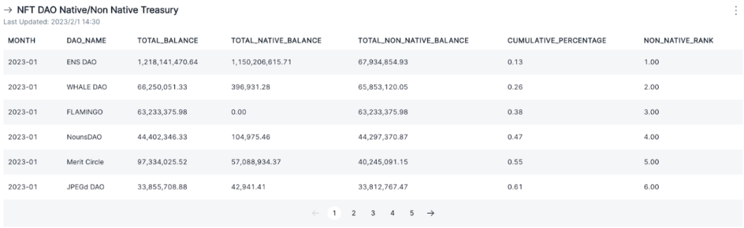 类似DeFi DAO,NFT DAO组织中同样也存在大量Native Token,除去Native Token之外,WHALE DAO,ENS DAO,FLAMINGO,Merit Circle,NounsDAO则持有较多资产。
