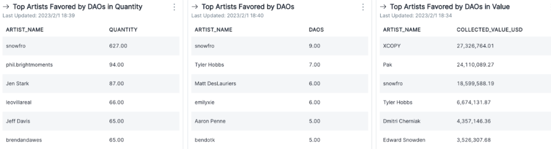 在NFT DAO当中,我们也看到许多专门收藏NFT的DAO组织崛起,诸如 WHALE DAO,FLAMINGO,Curatedxyz,Fingerprints DAO,Squiggledao,Bright Moments,Raw DAO,Jenny Metaverse DAO,Poseidon DAO,NEON DAO等,而最受这些DAO喜欢的艺术家前10为 XCOPY,Pak,Snowfro, Tyler Hobbs, Dmitri Cherniak ,Edward Snowden, Hackatao, Golid, Emilyxie, Torproject, Williamapan, Josh Katzenmeyer(价值角度)。