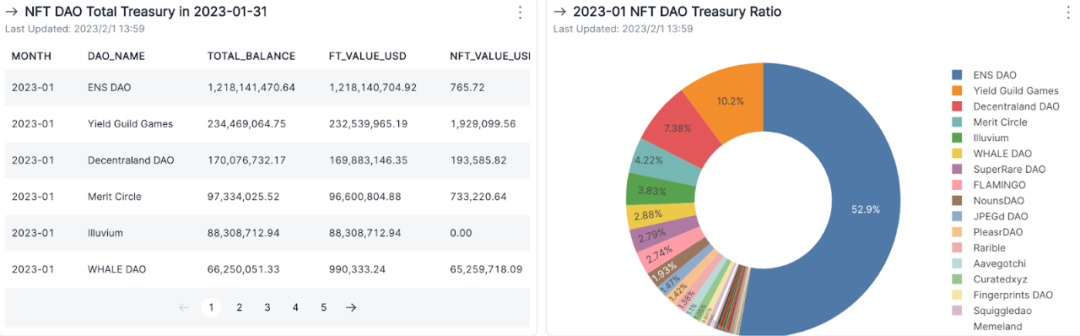 DAO组织「自下而上」的管理机制决定了其公开透明的内核及其必要性。在过去的几年里,牛市导致DAO国库极速膨胀,在2021年中旬增长至近350亿美金,达到顶峰。由于国库资金原生代币资产占比常年高于80%以上,因而国库资产总值和加密货币行情走势类似。截止2023年1月底,国库资产总值在124亿美金 ,其中DeFi相关DAO国库资产占据82%,NFT相关DAO国库资产占据18%。下文我们将以此为分类从数据角度简单剖析一下行业情况。