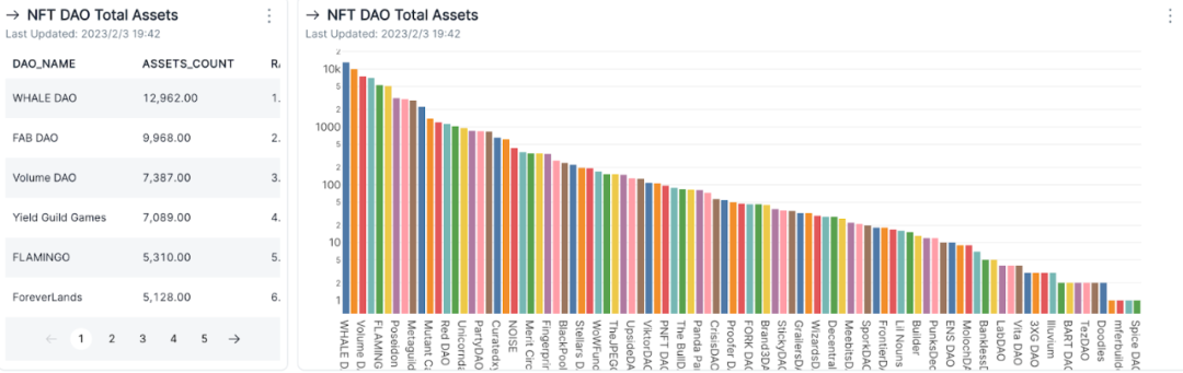 NFT DAO收藏的资产数排行前10为WHALE DAO,FABDAO(Tezos),Volume DAO(Tezos),, Yield Guild Games, FLAMINGO, Foreverlands, Poseidon DAO, Bright Moments, 其中WHALE DAO收藏了近1万3千件藏品,位居第一。