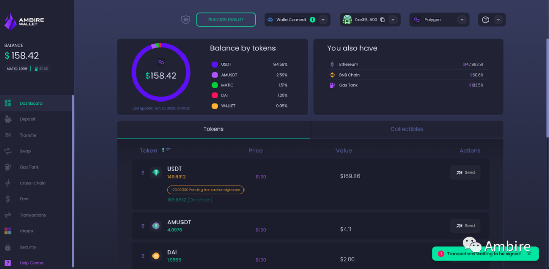 3. 大大改善了现有金融科技应用程序所熟悉的用户体验:默认的加密货币体验有着不必要的令人困惑的地方(例如,你发送了 100 USDT,但你的余额保持不变,同时你想知道你是否成功发送了这笔钱)。使用 Ambire,用户可以在发起交易后立即看到他们的余额更新。当用户即将收到资金时,他们的余额也会更新——这是其他加密钱包无法提供的功能。