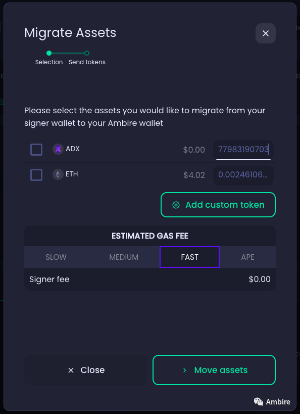 我们调整了资产迁移窗口,使其导航更加清晰,并尽可能快速、轻松地将加密货币从签名者钱包转移到 Ambire。