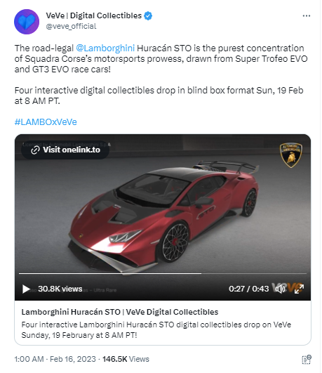 兰博基尼将于2月20日在NFT市场VeVe发布Huracán STO车型NFT