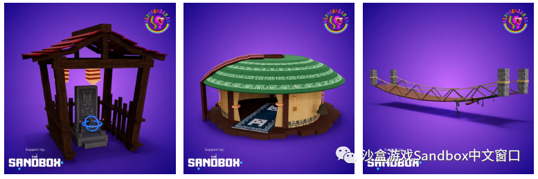 神殿 02(左);小屋 02(中);木桥 02(右)