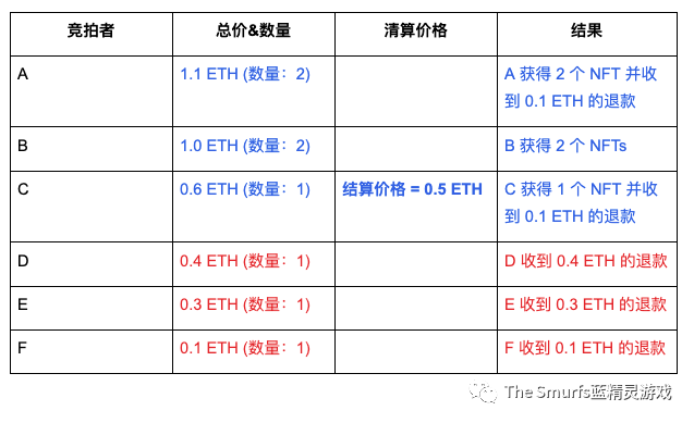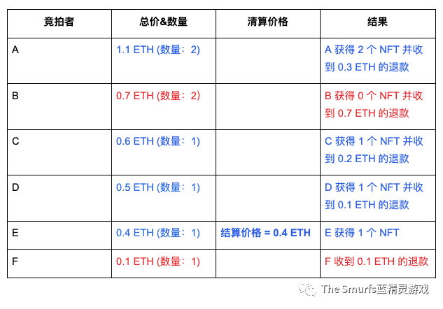 *注意到在场景 3 中,B 出价失败了,因为他选择了数量为 2,但没有达到 2 个 NFT 的结算价格。从技术上讲,他只为每个 NFT 出价 0.35 ETH,低于结算价格。