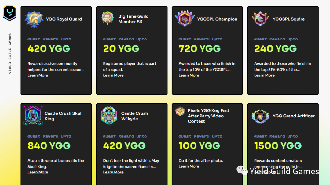 第三季对 GAP 进行了一些升级,最大的升级是迁移到新的 YGG dapp 以改善用户体验。另一个重大变化是增加了以用户为中心的任务,围绕角色原型设计,如为内容创造者设计的「 YGG 大工匠」成就和为社区管理员设计的「YGG 御林军」成就。这一季的重点是增加更吸引人的任务内容,细化标准和要求,同时也简化了奖励的计算,并建立了 GAP 理事会,用于文件、内容创作和功能建议。