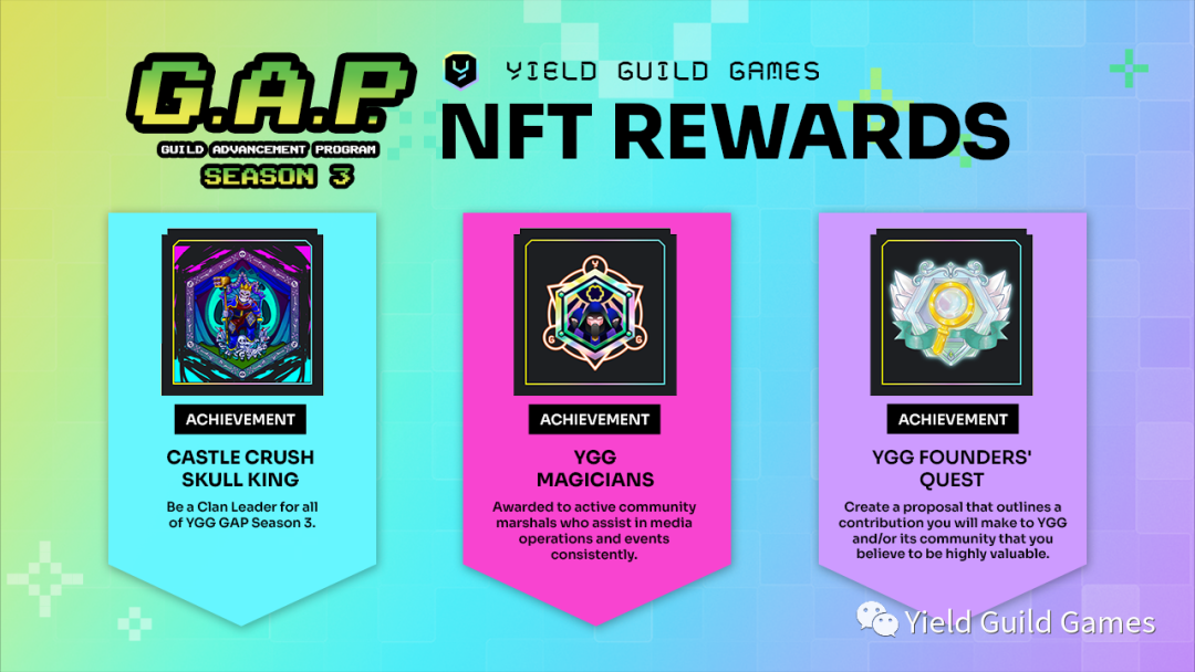 由 Cryptopop Art Guild (CPAG) 的艺术家设计,成就 NFT 由 YGG 直接铸造到参与者的钱包中,这些钱包与新的 YGG dapp 连接。与这些成就相关的奖励是 488,000 $YGG,分发给GAP 第三季的参与者。这些 YGG 代币于 6 月 2 日分发,可在 2023 年 7 月 3 日之前领取。