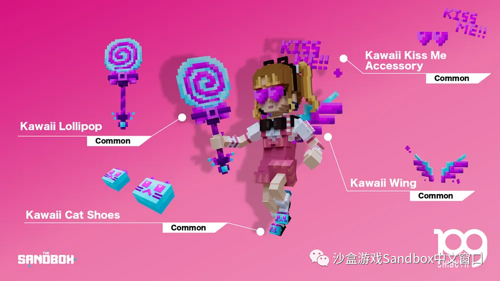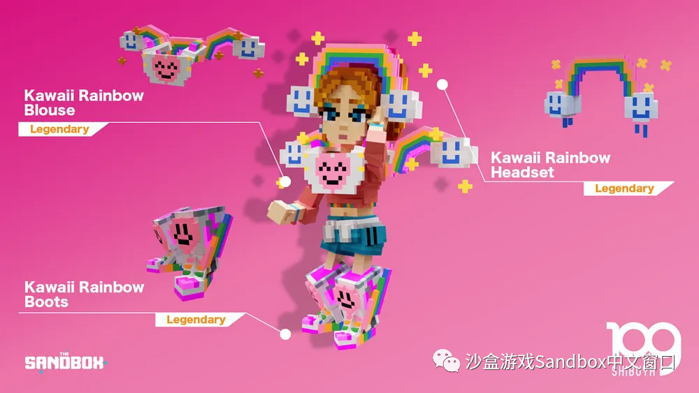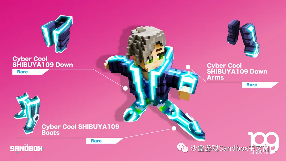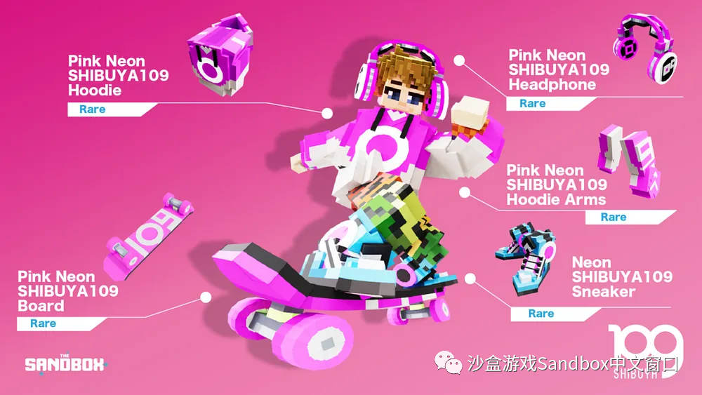 SHIBUYA109的可穿戴系列包括霓虹运动、山川、卡哇伊、流行、加布里猫、赛博朋克等风格的时尚单品,将于9月26日在TheSandbox的商店页面发售NFT系列,让玩家在虚拟世界中体验时尚潮流。