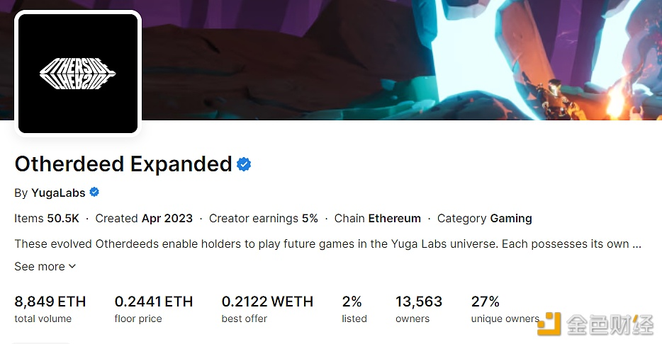 大约五个月前,Yuga Labs 宣布旗下元宇宙项目 Otherside 用户需要销毁原有 Otherdeed NFT 来兑换“Otherdeed Expanded”才能参与《Legends of The Mara》策略游戏,据悉 Otherdeed Expanded 是解锁未来游戏体验和激活权限的关键 NFT。另据 OpenSea 数据显示,本文撰写时 Otherdeed Expanded NFT 地板价为 0.2441 ETH,交易总额已达到 8,849 ETH。