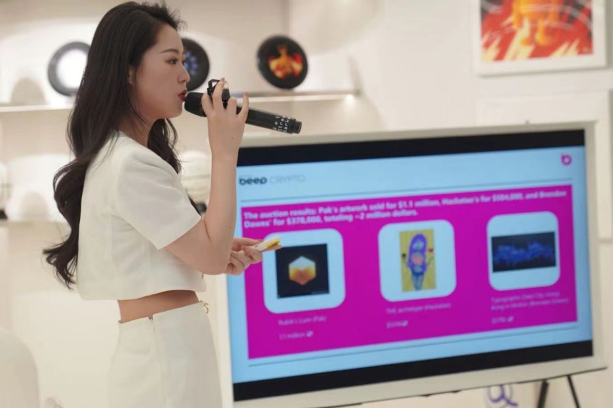 除了收藏之外,Mia和她所在组织还定期进行线上线下的艺术家展览和策划。在2021年底和2022年初,Mia所在组织与世界最大拍卖行之一苏富比联合拍卖了Pak、Hackatao、Brendan Dawes等三位艺术家的藏品,拍卖总额达150万美元。除国际拍卖行外,Whale还曾经与国内知名拍卖行如保利、永乐合作举办艺术品展览。
