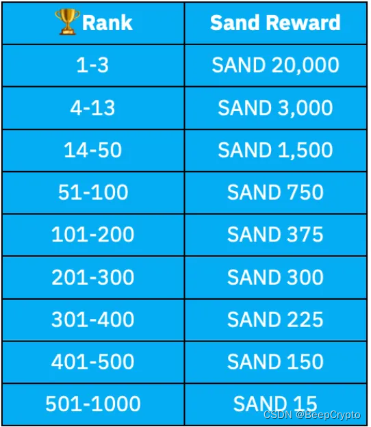 每两周,我们将截取等级截图,并根据表格分配奖励。奖励每两周发放一次。排名每两周重置一次。以下是两周参与活动的奖励结构明细: